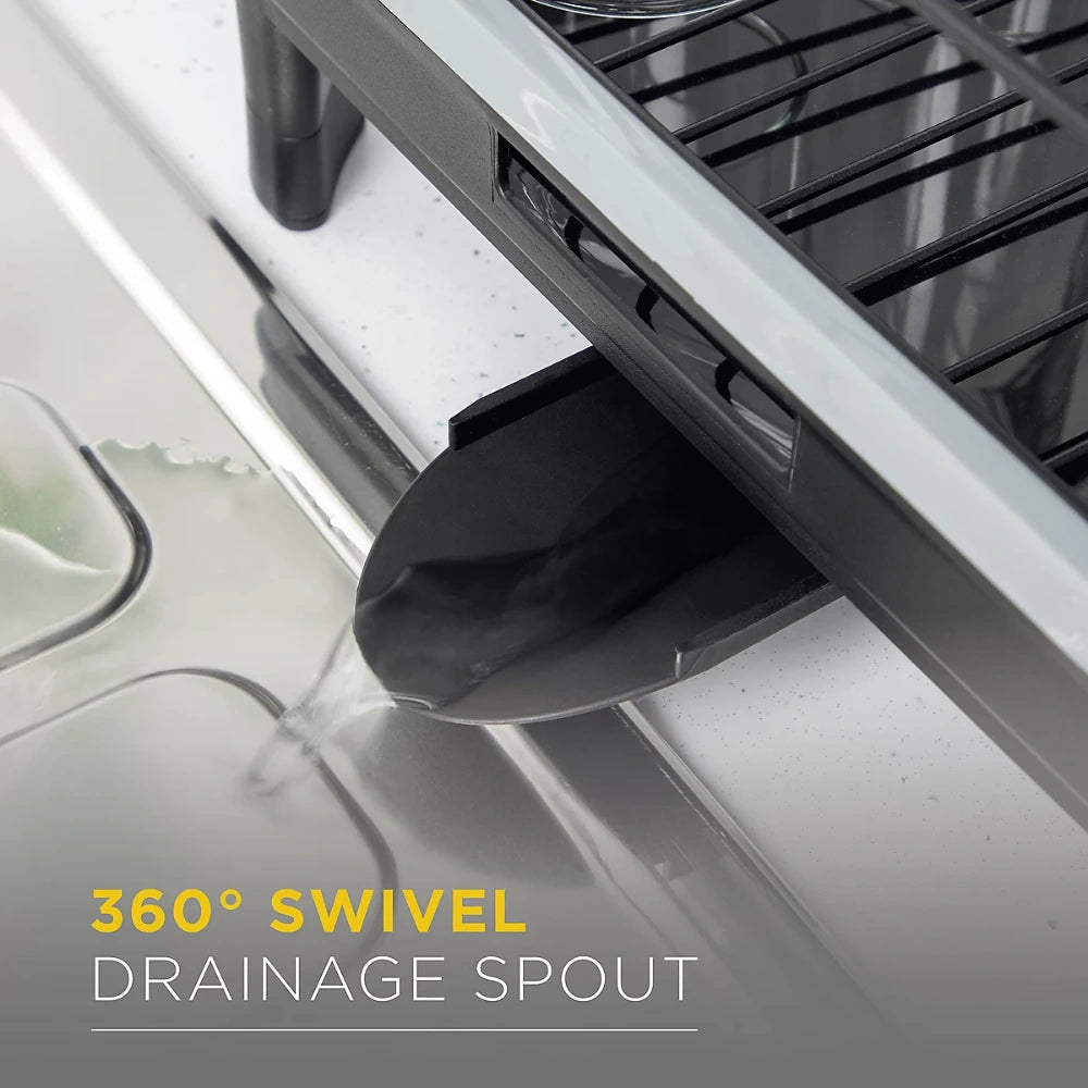 The upper tier securely holds plates, while the lower tier accommodates bowls, cups, and larger items, ensuring an efficient and organised drying process. Designed for convenience, it features an innovative drip tray with a concave centre to catch excess water, along with a 360° swivel spout that directs drainage straight into the sink—keeping your worktop dry and mess-free.
