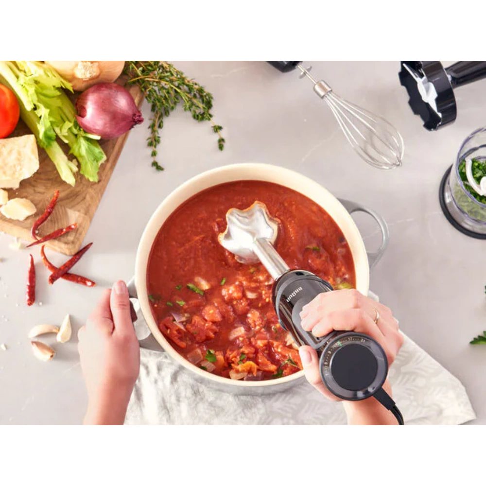 Enjoy maximum precision and power in the palm your hand – the new MultiQuick 5 Vario hand blender gives you 21 easily adjustable speeds for more precise blending results. The speeds are easily adjustable with your thumb and the highly efficient 1000-watt motor gives you the power you need to make quick work of a wide range of foods.