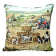 A square shaped cushion with a farm scene design including sheep, border collie dogs, tractor and more.