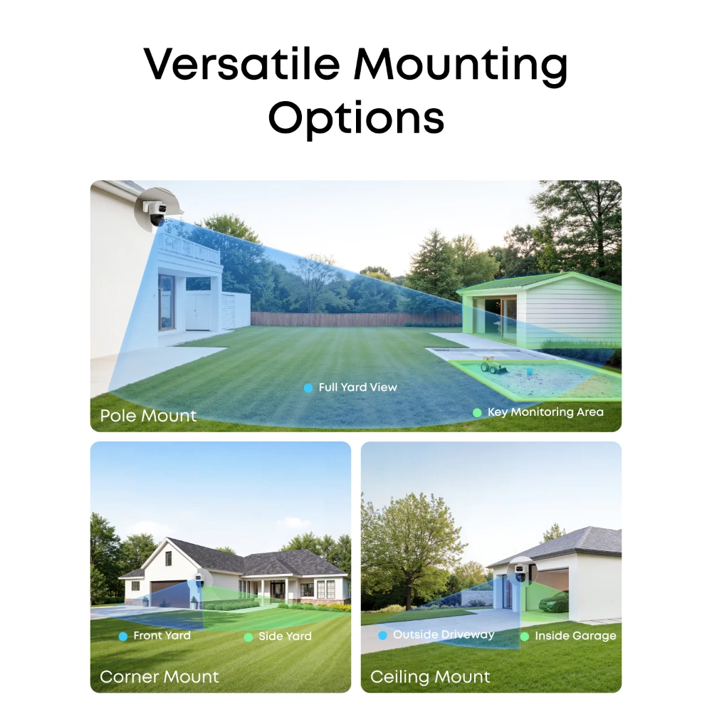 4 16 MP Triple-Lens Bullet-PTZ Cameras: The upper 4K wide-angle lens delivers a 122° fixed view of the area, while the lower 2K Pan-Tilt-Zoom lenses feature 8× auto-zoom and 360° pan for complete coverage. Note: To ensure seamless security, update your eufy app to version 5.0.71 or above.