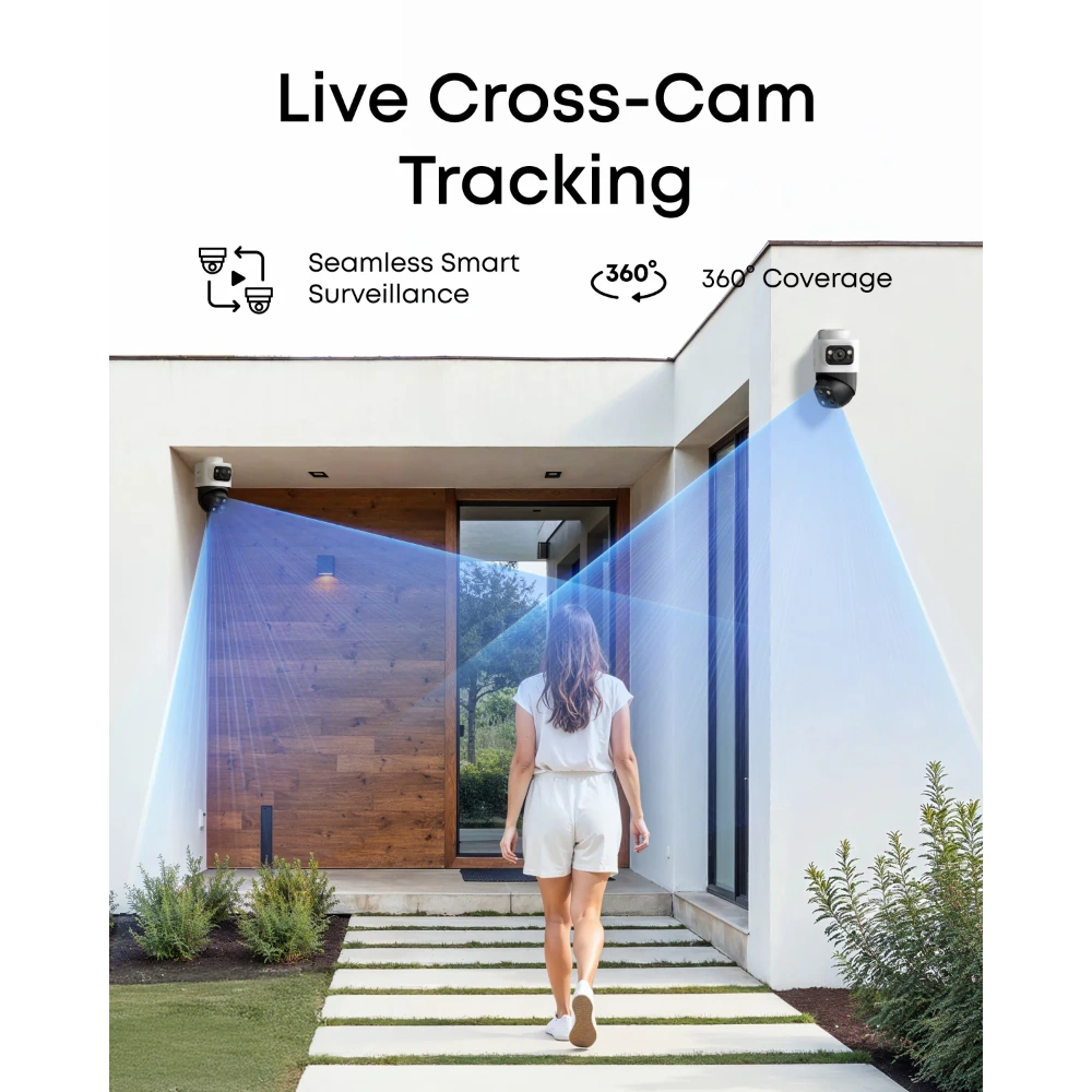 Live Cross-Cam Tracking: All your cameras work in sync to track movement in real-time. When one camera reaches its limit, another takes over instantly, ensuring continuous, uninterrupted coverage around your home.