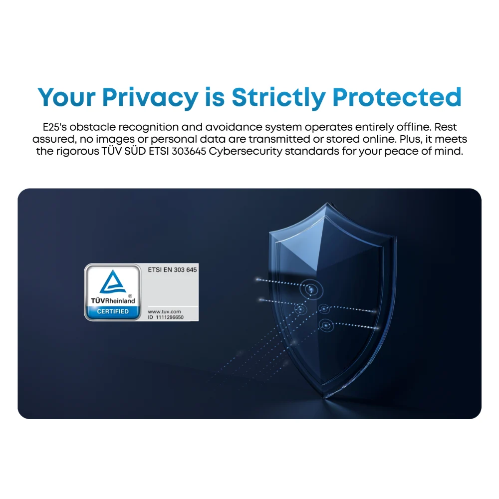 E25's obstacle recognition and avoidance system operates entirely offline. Rest assured, no images or personal data are transmitted or stored online. Plus, it meets the rigorous TÜV SÜD ETSI 303645 Cybersecurity standards for your peace of mind.