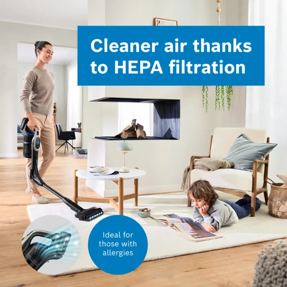 The unique MicroClean™ Technology redefines vacuuming. The MicroClean™ Brush with LED lights has Bosch's best dust pick-up and removes even invisible dust. The MicroClean™ Sensor detects microscopic particles that are invisible to the human eye. Once the MicroClean™ Ring is fully illuminated blue, you can rest assured that your floors are thoroughly clean.