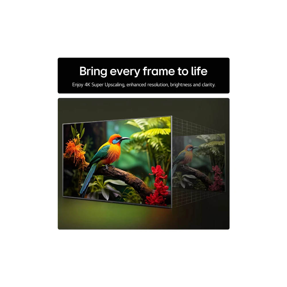 LG's powerful processor boosts the resolution to the original quality. Enjoy 4K Super Upscaling enhanced resolution, brightness, and clarity.