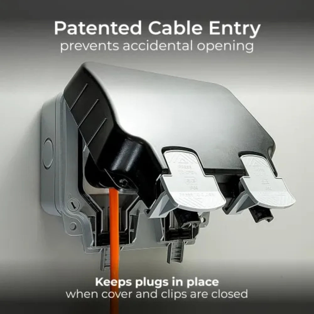 A retaining clip ensures the lid stays firmly shut when not in use, protecting the power supply.