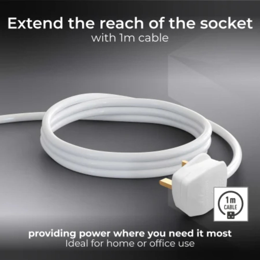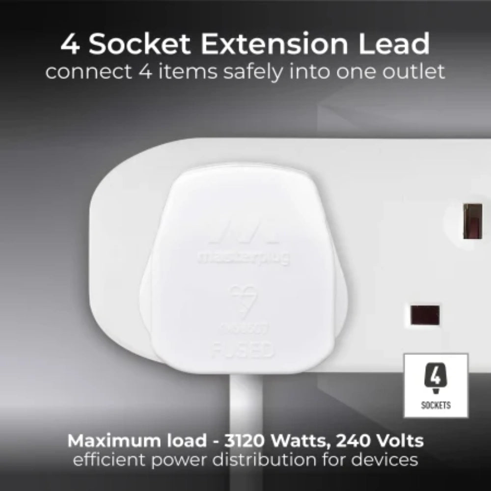 This Masterplug four socket extension lead eliminates the problem when the number of electrical items outnumber the number of available sockets. With a 1 metre cable, this four socket extension lead is great to use in the home as well as in the office.