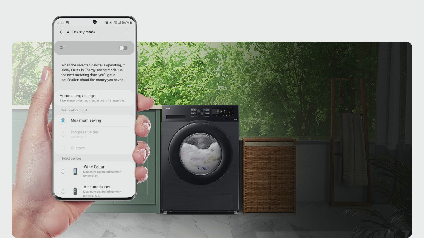 Monitor and reduce the washer’s energy use. AI Energy mode lets you check the power consumption and estimates your electricity bill. For courses that operate in AI Energy mode it reduces energy use by up to 70% using Ecobubble to wash with cool water instead of warm and extra cycle time.