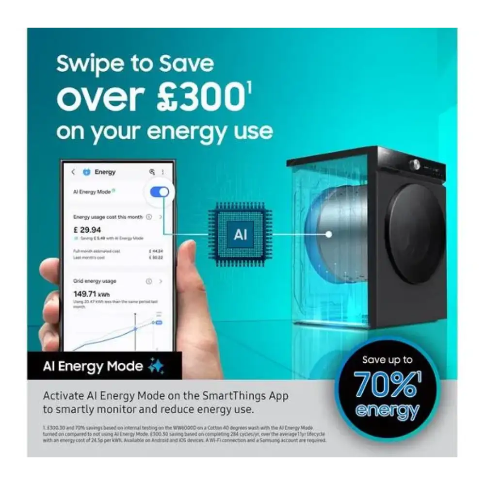 SmartThings AI Energy Mode monitors your laundry habits and energy usage, reducing consumption by up to 70%. The A-rated energy efficiency keeps both electricity bills and your carbon footprint low.