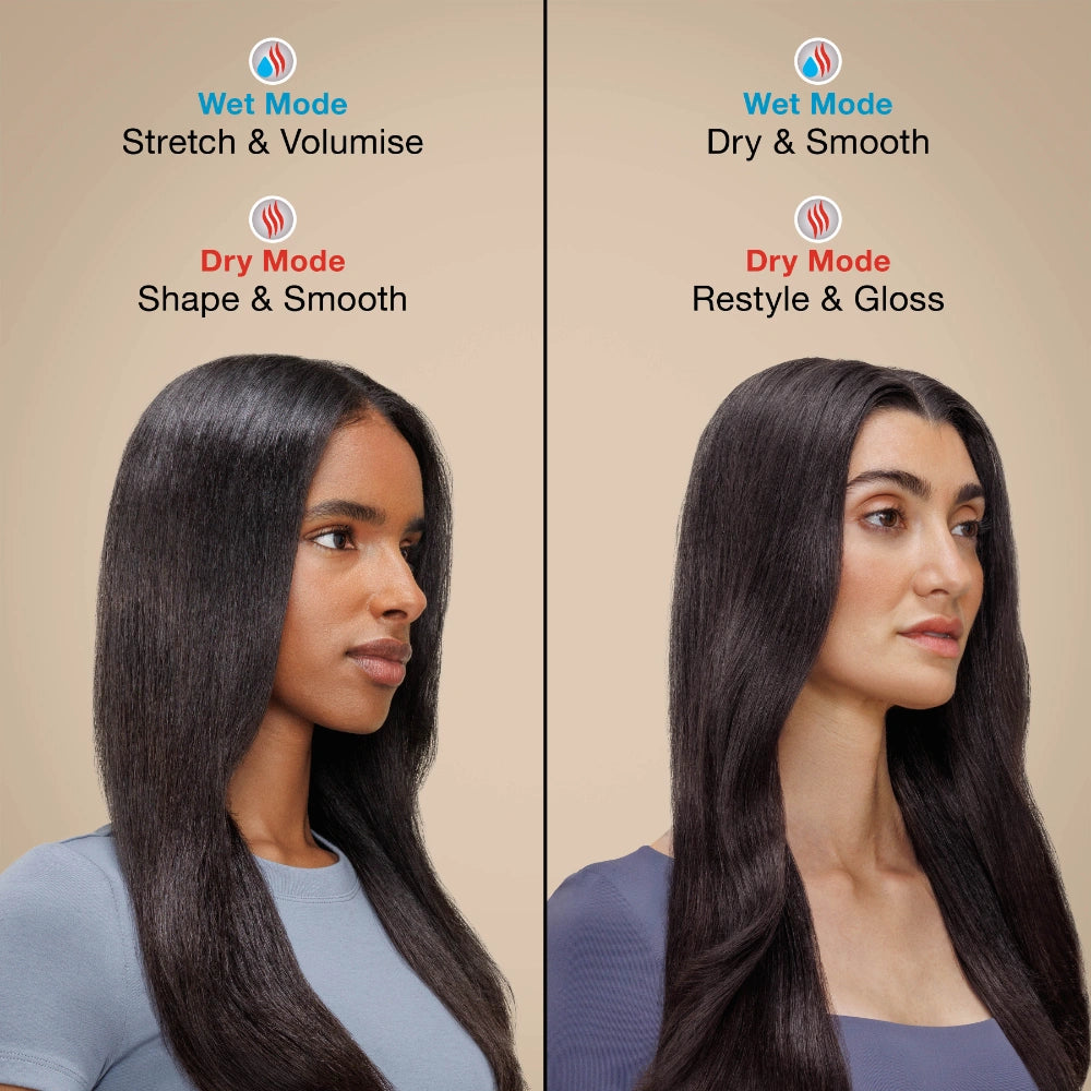Designed for use on wet or dry hair, you can style with confidence in two distinct modes. Wet Mode adds volume and lift, while Dry Mode smooths and refreshes with every pass. Go from wet to shiny, glossy dry hair – all with one tool.