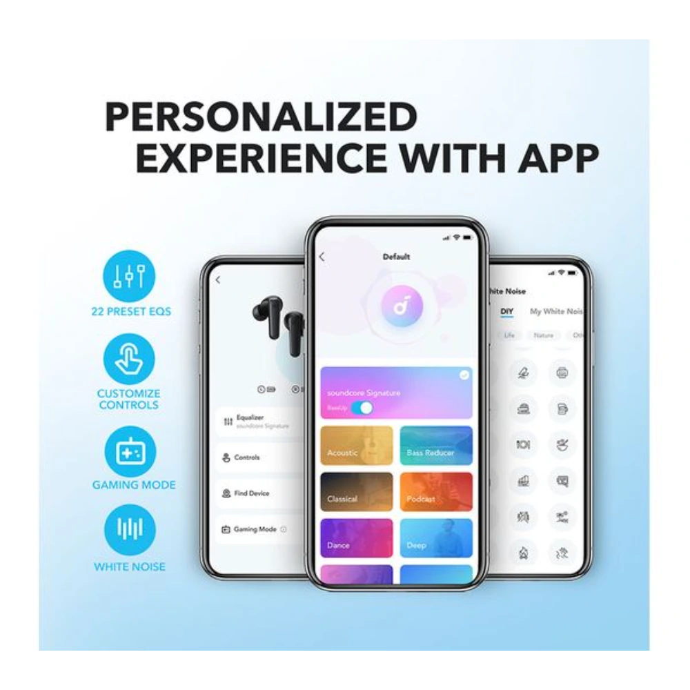 soundcore R50i true wireless earbuds are lightweight with an ergonomic shape to fit comfortably in your ears for long listening sessions.