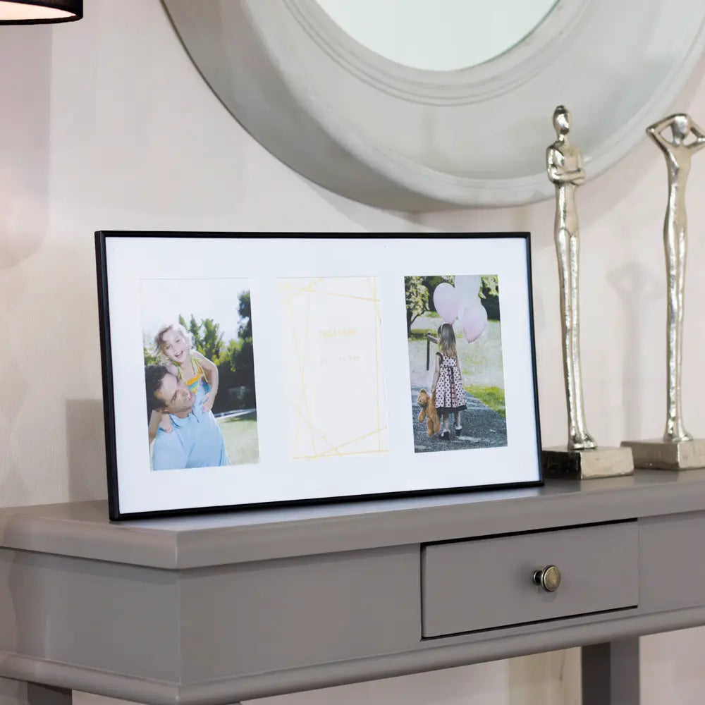 The Tara Lane Lisa 3 Photo Collage Frame in Black offers a chic and simple way to present your favorite memories. Designed to hold three 5" x 7" photographs, this collage frame features a slim black edge and a crisp white mount that brings a clean, gallery-style elegance to any space.