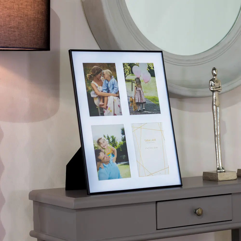 Create a personal photo story with the Lisa Collage Frame in sleek black. Designed to hold four 5" x 7" images, this frame allows you to display a series of special moments in a cohesive, elegant format. Its slim black edging and clean white mount give it a contemporary gallery-style look that fits seamlessly into any décor. Whether standing on a sideboard or hanging on the wall, the Lisa collage frame adds warmth and personality to your space—ideal for celebrating family, friends, or favorite snapshots. A timeless piece perfect for home or office.