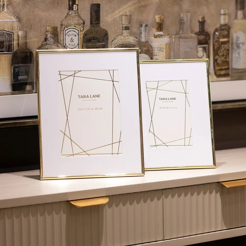 The slim gold edges offer a modern, minimalist aesthetic that complements any décor. Whether placed on a shelf, desk, or hung on a wall, the Lisa frame is a versatile and stylish way to display photographs, prints, or artwork while keeping them protected behind a durable glass front. Perfect for both everyday moments and special occasions.